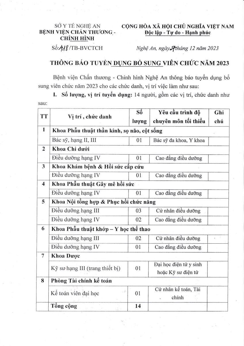 Bệnh viện Chấn thương Chỉnh hình Nghệ An xin thông báo tuyển dụng viên chức năm 2023 như sau: